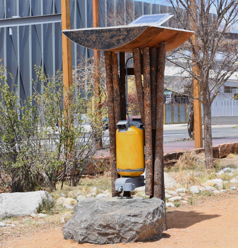The ostensible function of this installation is to keep a small amount of water in a depression on the upper surface of a boulder. Adjacent to the boulder is a vertical construction which supports a small steel tank containing tap water. A solar panel provides power for a network of electrical devices – sensors, valves, actuators – that are managed by a microcontroller. Two ounces of water can be released from the tank onto the boulder by the viewer by pressing a button on the Control Panel if rock is dry. On a regular schedule, a sensor mounted to the tap water tank will check the status of the pocket on the rock and if it is dry, it will activate the release of two ounces of water onto the rock. This work responds to environmental conditions and its construction makes use of salvage industrial materials as well as natural materials. These contrasting materials echo a theme of urban ecology – technology and biology intertwined. This artwork was exhibited at the Santa Fe Railyard Park.