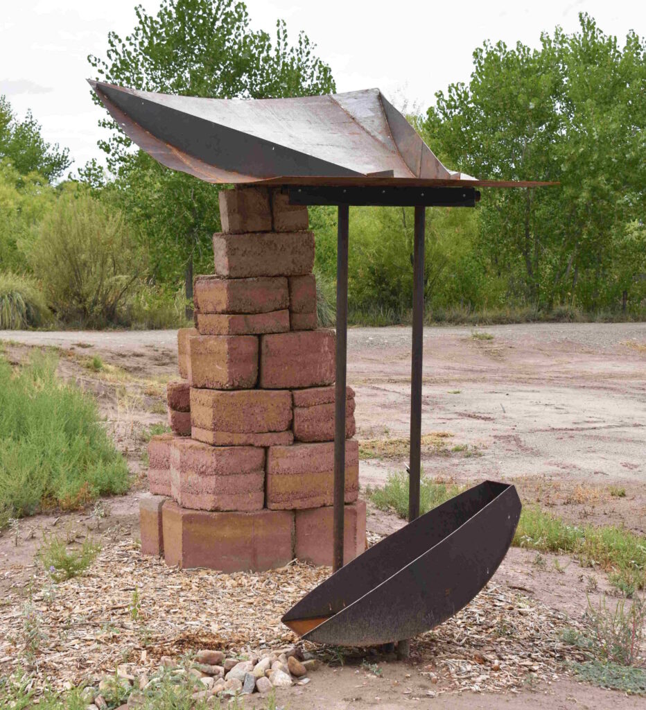 The “cairn” (often used to mark a mountain summit) constructed of compressed earth blocks – instead of rocks – is a connection to the mountains – our water source. The curved steel plane with central trough creates a gesture of water collection and harvesting. While the installation is most functional during or after a rain, the gesture at its core is very much alive even when it is dry. Located at the Albuquerque Open Space Visitors Center.